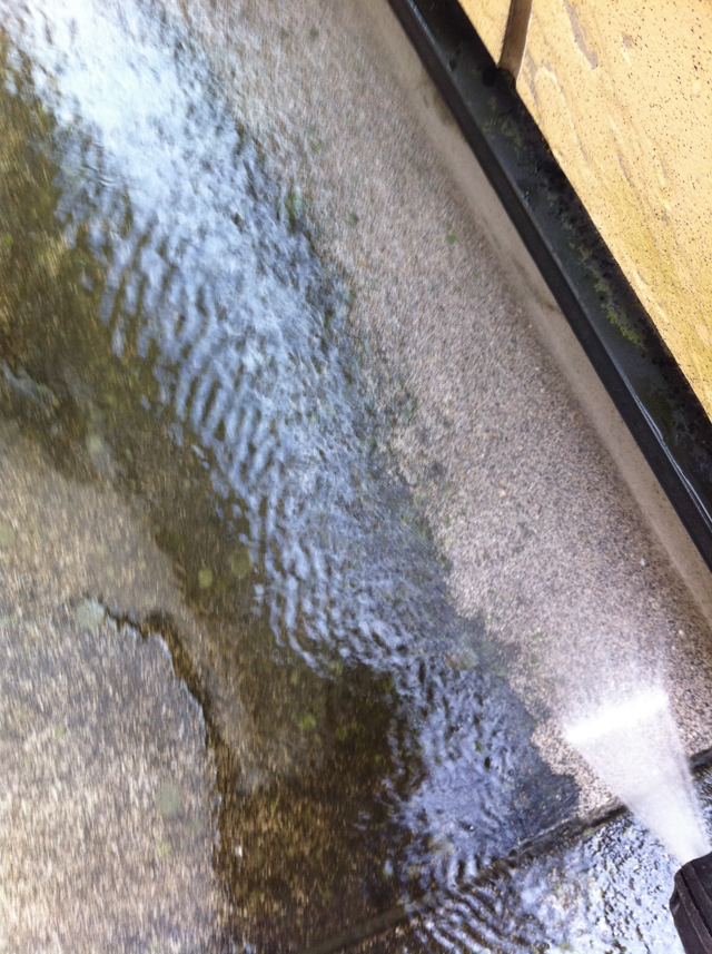 ちなみにこのくらい汚れてしまうとデッキブラシでこすったくらいではなかなか落ちません。それを水の力で一気に落としていきます。しつこい汚れの時にはノズルをサイクロンジェットノズルに変えれば、ほとんどの場合、汚れを落とすことができます。