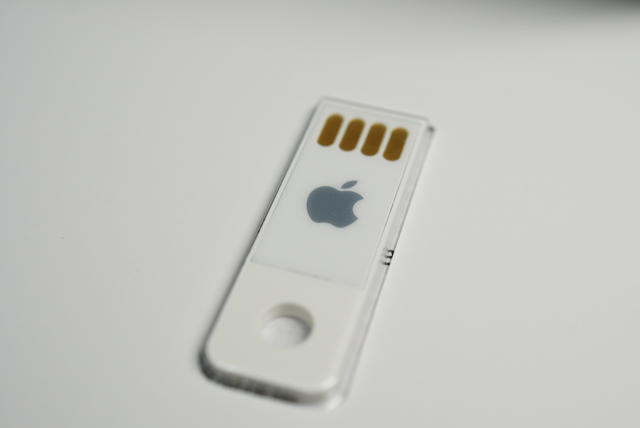 MacBook AirはスピンドルレスなのでインストールCDは付いてきません。その代わりにOSメディアとしてUSBメモリが付いています。ここにもマークが。このメモリカードを単体で売ったら売れそうな気がします。