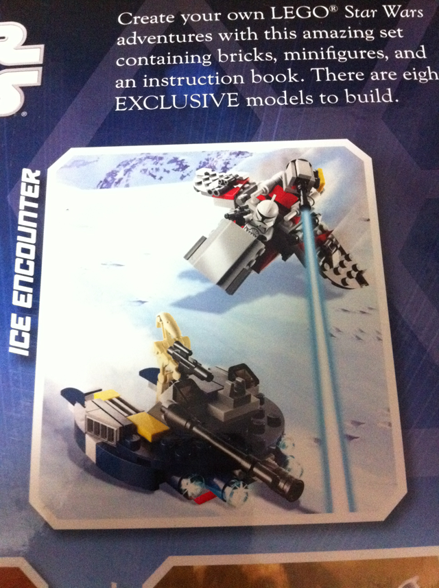 パッケージに表示されていますが、240pcs以上のLEGOが入っていて、4つのシナリオ毎に2種類のモデルを組み立てられるようになっています。本の形をしていますが、パーツとインストラクションのみです。ミニフィグはClone Trooper、Battle Droidがそれぞれ1体ずつ含まれています。 裏面に作れるモデルが書かれています。