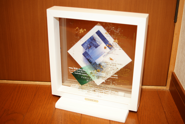 また、ガラス絵という面白い作品も展示されていました。2枚のガラスがケースの前後にはめ込まれており、それぞれのガラスにプリンティングがされています。写真ではちょっと分かりにくいですが、立体感のあるとても不思議な作品です。この作品は Impression というタイトル。これもギャラリーにそもそも展示されていたものでは無いのですが相方がえらく気に入ってしまい、こちらも連れて帰りました。