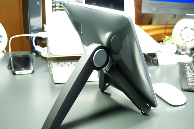 こんな感じで開きます。足はもう一段階伸ばすことができますが、この長さでiPadの縦置きにちょうどよい広さになります。横置きもこの長さで充分です。MacBookなどを置くのであれば足を伸ばして使うことになるのだと思います。