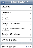 iPhoneの「設定」-「メール/連絡先/カレンダー」を選び、「アカウント」の中からNuevaSyncと連携させるためのアカウントを選択し、このアカウントで同期していたカレンダー選択を「オフ」に変更します。