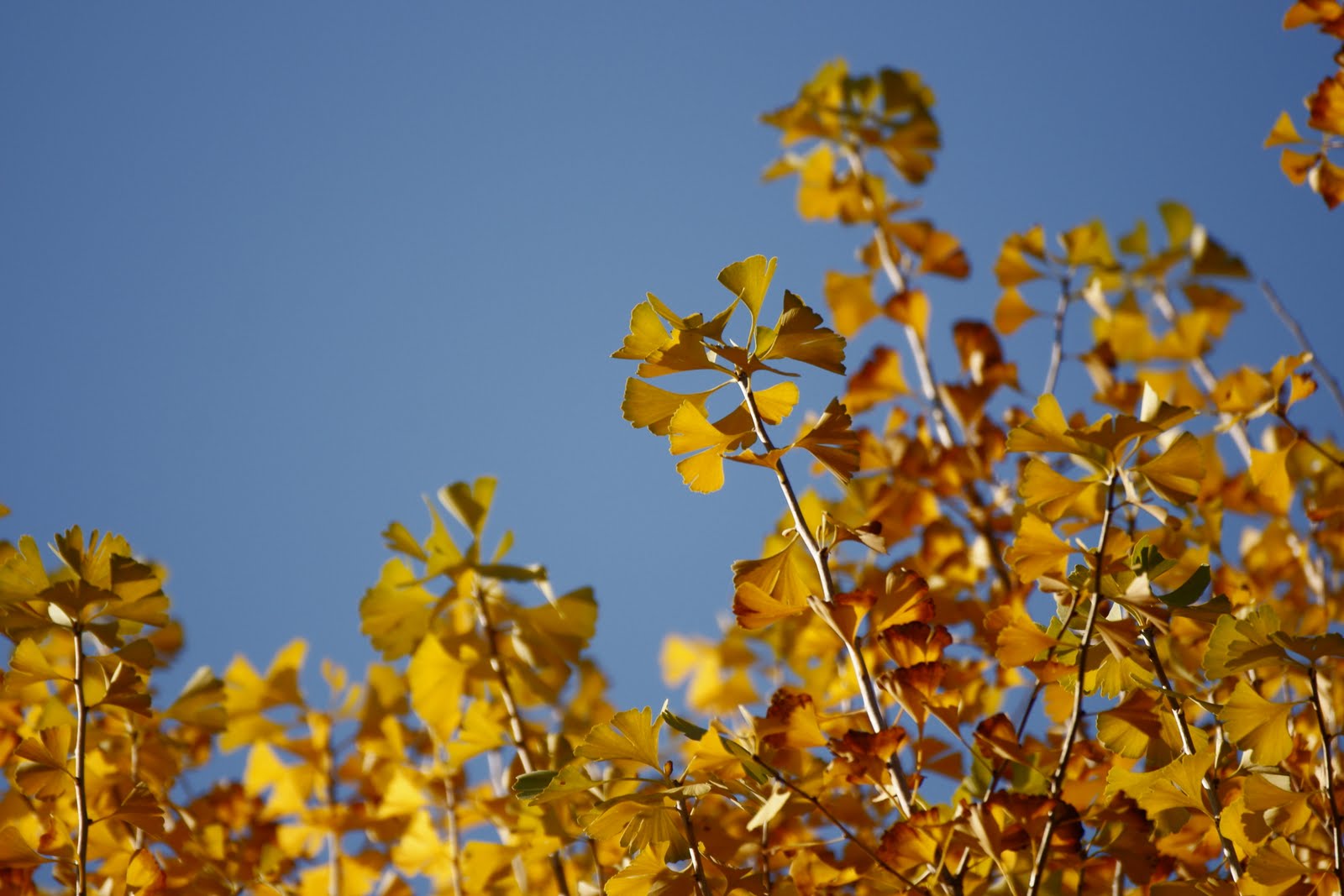 同じ神社のイチョウ。まだ枯れておらず、空から浮き上がったように切り取れた一枚。高さにして5mくらいのところにあるイチョウの葉を切り取れるのも300mmという長さのおかげです。